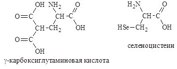 В состав белка протромбина (белок свертывания крови) входит g-карбоксиглутаминовая кислота, а в ферменте глутатионпероксидазе открыт селеноцистеин, в котором ( S ) сера заменена на ( Se ) селен.
