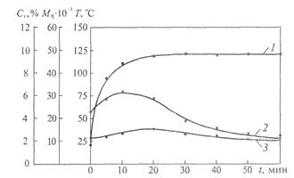 Рис. 1. Зависимость температуры (1), средневязкостной молекулярной массы (2) и содержания гель-фракции (3) от продолжительности механической обработки каучука СКС-ЗОРП