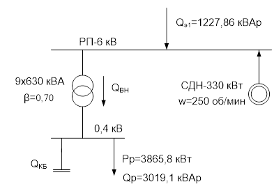 - реактивная мощность, генерируемая СД до присоединения к сети проектируемого предприятия, т.к. СД вводится вновь, то