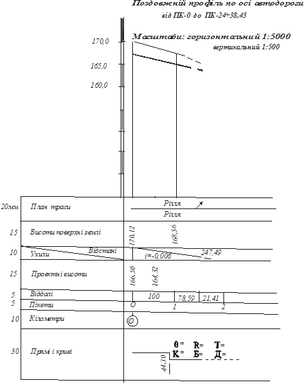 – висоти точок, відповідно проектна і фактична. Робочі висоти показують насип, або виїмку в різних точках профілю. При насипі їх виписують на профілі вище, а при виїмках - нижче проектної лінії.