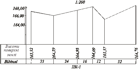 Поздовжній профіль земної поверхні складають і викреслюють за результатами обробки польових журналів нівелірного ходу, вимірювання горизонтальних кутів та пікетажного. Оскільки різниця висот точок земної поверхні набагато менша ніж відстань між цими точками, то профілі викреслюють в різних масштабах, тобто відношення масштабів часто приймають 1:10 (рис. 6).