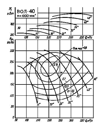 Рис. 1. Аэродинамические характеристики вентилятора ВОД-40.