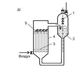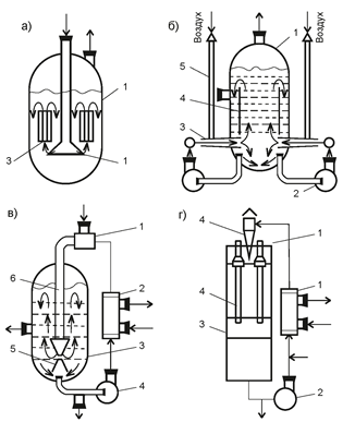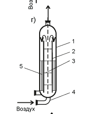 г) газлифтный: 1 – корпус,2 – диффузор, 3 – диспергатор, 4 – воздухораспределитель, 5 – теплообменник,