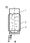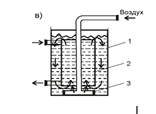 б) барботажный колон-ный: 1 – корпус, 2 – рубашка, 3 – воздухораспределитель, в) барботажно-эрлифтный: 1 – корпус, 2 – диф-фузор-теплообменник, 3 – воздухораспределитлье;