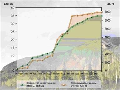 Всего в Российской Федерации к началу 1999 г. функционировали 34 национальных парка, суммарная официально установленная площадь которых составляла 6784,6 тыс. га, а к началу 2000 г. – 35 парков общей площадью 6956 тыс. га (Рис. 10).