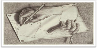 Центральная идея самовоспроизведения, взятая на вооружение Эшером, обращается к загадке человеческого сознания и способности человеческого мозга обрабатывать информацию так, как не сможет обработать ни один компьютер. Литографии «Рисующие руки" и "Рыбы и чешуйки" используют эту идею разными способами. Самовоспроизведение является направленным действием. Руки рисуют друг друга, создавая самих себя. При этом сами руки и процесс их самовоспроизведения неразделимы. В работе "Рыбы и чешуйки" концепция самовоспроизведения представлена более функционально, и в данном случае она может быть названа самоподобием. В этом смысле данная работа описывает не только рыб, а все живые организмы, в том числе и человека. Конечно, мы не состоит из уменьшенных копий самих себя, но каждая клетка нашего тела несет в себе информацию обо всем теле в виде ДНК.