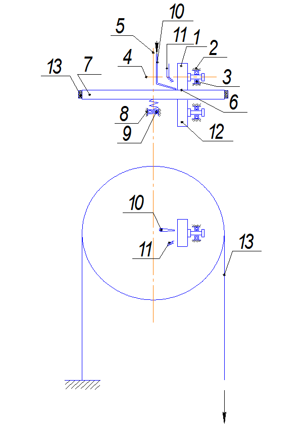 Лобовой вариатор (рис.2) содержит ведущий диск 1 закрепленный на подвижной опоре 2 в подшипниках 3, который может перемещаться вдоль оси 4 ^ оси вращения ведомого диска 5, совершая вращательное движение по поверхности контакта 6 и передавая крутящий момент ведомому диску 7, установленному на неподвижной опоре 8, в подшипниках 9. С помощью трубки 10 в зону контакта подается ферромагнитная жидкость, а катушка 11 создает магнитное поле. Для предотвращения нагрузки на валы предусмотрен прижимной ролик 12. Торможение диска осуществляется с помощью натяжной ленты тормоза 13.