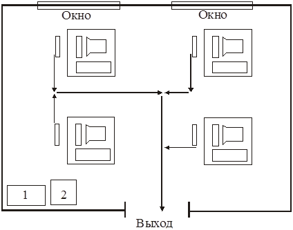 Помещение находится на втором этаже шестиэтажного здания, количество работающих –– 4 человека. Таким образом, объем помещения, приходящийся на одного работника, составляет 24 , а площадь на одного работника составляет 8 , что соответствует требованиям ГОСТ 12.2.032 ССБТ. Рабочее место при выполнении работ сидя, (6 м2