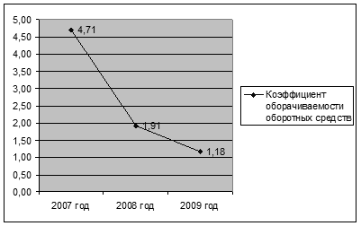 Период оборота денежных средств с 2007 по 2009 год снизился на 1,624 (с 2,214 до 0,590 оборотов), что говорит о повышении эффективности их использования, незначительном повышении ликвидности оборотного капитала и его оборачиваемости, а также говорит о введении средств в оборот.