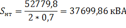 Мощность силовых трансформаторов определим по формуле (39). Число трансформаторов принимаем равным 2. Мощность трансформаторов выбирают с учетом коэффициента загрузки, равным 0,65÷0,7 в нормальном режиме. Таким образом, мощность трансформатора ориентировочно определяется из условия: