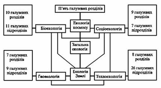 Перетворення екології з біологічної науки з чітко визначеним предметом дослідження (системи організмів та їх зміни в часі й просторі) на складний конгломерат багатьох царин знань значною мірою зумовлене складністю та різноманітністю об'єктів її зацікавлення, великою кількістю взаємозв'язків між ними і незліченністю їхніх характеристик. Комплексність і першорядність проблем, які покликана розв'язати екологія, зумовлюють її прискорений розвиток та ускладнення. Тому схеми структури сучасної екології є суто ілюстративними, а деякі з них містять десятки прямокутничків і багато стрілочок, нагадуючи радіоаматорам схеми телевізорів чи радіоприймачів тих часів, коли вони складалися не з блоків, а з окремих ламп, конденсаторів, резисторів і провідників. Ми ж обмежимося наведеною на рис. спрощеною структурною схемою екології, де зазначено приблизну кількість її вужчих підрозділів. Кожен з них цікавий сам по собі, але важливіша комплексність, поєднання зусиль учених з багатьох наук і царин досліджень, так з відображенням мінімальної кількості внутрішніх зв'язків та взаємодій само, як і застосування засобів, методів та досягнень інших наук про природу — фізики, хімії, біології, кібернетики, математики та ін. Екологія нині отримує більше моральну, ніж фінансову підтримку. На неї не зважали в колишньому СРСР, проте й на Заході було чимало тих, хто зараховував екологів мало не до "запеклих ворогів" технічного й технологічного прогресу. Лише кілька великих катастроф танкерів з дуже серйозними шкідливими екологічними наслідками 50-х і початку 60-х років минулого століття обурили громадськість розвинених країн такою мірою, що уряди вперше створили екологічні комітети або міністерства, змусили спрямувати частину бюджету на "природоохоронні заходи". На ці роки припадає створення перших впливових міжнародних екологічних організацій, прийняття різноманітних угод і конвенцій.