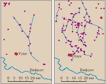 Рис. 2. Рост числа поселений (точки) и строительство ирригационных каналов (линии) в Месопотамии близ Урука [9].