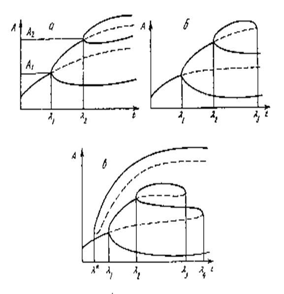 б.- Бифуркация с неустойчивой ветвью развития. Может соответствовать кризису "общества потребления", имеющего весьма высокие жизненные стандарты.