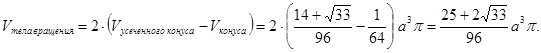 Решение:В результате вращения образуется тело вращения, состоящее из двух усеченных конусов с общим основанием. Причем, в каждом из них «вырезается» конус при меньшем основании (см. рис.). Таким образом,