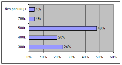 , 12 респондентов более устраивает фасовка 500г.(48%). На втором месте ответ 300г. – 6 человек (24%), на третьем месте 5 человек (20%) – 400г. На четвертом вариант ответа 700г. – 1 человек (4%) и «без разницы» - 1 человек (4%).См. рис.4.