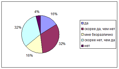 : «Довольны ли Вы оформлением товара?», голоса распределились следующим образом: 1. «скорее да, чем нет» и «скорее нет, чем да» по 8 человек (32%); 2. «да» и «мне безразлично» по 4 человека (16%); 3. «нет» - 1 человек (4%). См. рис.5.