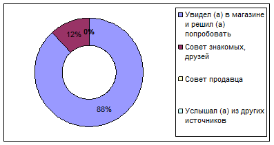 получены следующие результаты: 1. Увидел (а) в магазине и решил (а) попробовать – 22 человек (88%); 2.Совет знакомых, друзей- 3 человек (12%); 3.Совет продавца и услышал (а) из других источников не ответил ни один из опрошенных. См. рис.6.