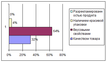 . При выборе сухарей большинство респондентов руководствуются вкусовыми свойствами – 16 человек (64%), 8 человек (32%) руководствуются качеством товара и лишь один человек (4%) наличием красивой упаковки. См. рис.7.