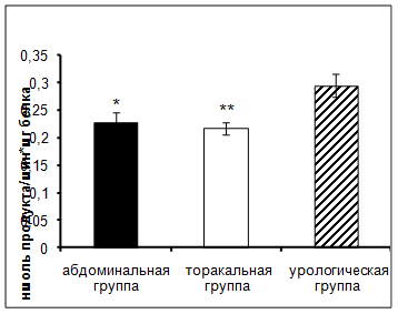 1. Обнаружено увеличение активности карбоксипептидазы N у торакальной и абдоминальной групп по сравнению с урологической группой онкологических больных в раннем послеоперационном периоде.