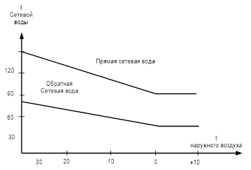 Для построения годового графика необходимо знать длительность стояния различных температур наружного воздуха в отопительный период для данного климатического пояса, где сооружается ТЭЦ или котельная, определить часовой расход теплоты на отопление, вентиляцию и горячее водоснабжение в зависимости от температуры наружного воздуха построить температурный график сети (рис 6) соответственно температурному, графику и продолжительности каждого расхода построить годовой график отпуска теплоты.