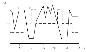 Рис.7 Суточное электропотребление (кривая 1) и тариф, дифференцированный по времени суток (кривая 2), для электрометаллургического завода в Германии