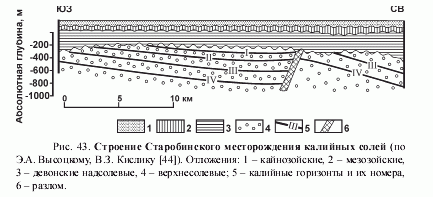 Основной сырьевой базой калийной промышленности Беларуси является Старобинское месторождение, открытое в 1949 г. (рис. 43). Проведены детальная разведка Петриковского и предварительная разведка Октябрьского месторождений калийных солей. В Припятском прогибе имеется также ряд высокоперспективных участков, на которых сосредоточены значительные ресурсы калийных солей (Нежинский, Смоловский, Новодубровский, Копаткевичский, Житковичский и др.).