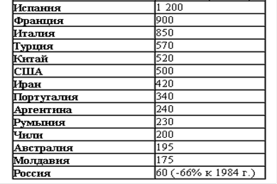 Россия на сегодняшний день занимает одно из последних мест по площади посадок виноградников среди стран - производителей винограда и виноградного вина в мире. Площади посадок в ведущих странах (Испания, Франция, Италии) составляют от 850 до 1 200 тыс. га (Таблица 1). В России площади посадок составляют всего 60 тыс. га, что на 66% меньше чем было в 1984 г. (около 185 тыс. га). Россия имеет все возможности увеличить площади посадок как минимум до показателей 1984 г. и сократить свою импортозависимость по виноградному сырью.