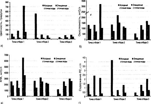 Каждую пробу сточных вод очищали методом комплексообразования. По стандартным методикам определяли цветность, окисляемость, ХПК исходных и очищенных стоков, а также содержание в них ЛС (рис. 2).