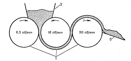 имеют два или три валка с гладкой поверхностью, вращающиеся навстречу друг другу с разной скоростью, что обеспечивает переход мази с вала на вал и увеличивает трение между ними [4].