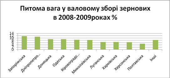 Рис. 1.1. Питома вага регіонів у виробництві зерна 2008-2009 рр.