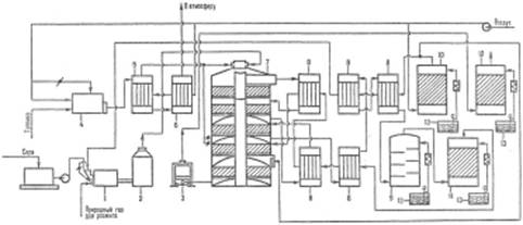 Производство серной кислоты из серы по методу двойного контактирования и двойной абсорбции (рис. 1) состоит из следующих стадий. Воздух после очистки от пыли подается газодувкой в сушильную башню, где он осушается 93-98%-ной серной кислотой до содержания влаги 0,01% по объему. Осушенный воздух поступает в серную печь после предварительного подогрева в одном из теплообменников контактного узла. В печи сжигается сера, подаваемая форсунками: S + О2 = SO2 + 297,028 кДж. Газ, содержащий 10-14% по объему SO2, охлаждается в котле и после разбавления воздухом до содержания SO2 9-10% по объему при 420°С поступает в контактный аппарат на первую стадию конверсии, которая протекает на трех слоях катализатора (SO2 + V2O2 = SO3 + 96,296 кДж), после чего газ охлаждается в теплообменниках. Затем газ, содержащий 8,5-9,5% SO3, при 200°С поступает на первую стадию абсорбции в абсорбер, орошаемый олеумом и 98%-ной серной кислотой: SO3 + Н2О = Н2SO4 + 130,56 кДж. Далее газ проходит очистку от брызг серной кислоты, нагревается до 420°С и поступает на вторую стадию конверсии, протекающую на двух слоях катализатора. Перед второй стадией абсорбции газ охлаждается в экономайзере и подается в абсорбер второй ступени, орошаемый 98%-ной серной кислотой, и затем после очистки от брызг выбрасывается в атмосферу.