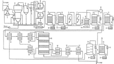 1 - тарельчатый питатель; 2 - печь; 3 - котел-утилизатор; 4 - циклоны; 5 - электрофильтры; 6 - промывные башни; 7 - мокрые электрофильтры; 8 - отдувочная башня; 9 - сушильная башня; 10 - брызгоуловитель; 11 - первый моногидратный абсорбер; 12 - теплообменники; 13 - контактный аппарат; 14 - олеумный абсорбер; 15 - второй моногидратный абсорбер; 16 - холодильники; 17 - сборники.