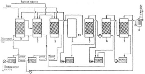 1 - денитрационная башня; 2, 3 - первая и вторая продукционные башни; 4 - окислительная башня; 5, 6, 7 - абсорбционные башни; 8 - электрофильтры.