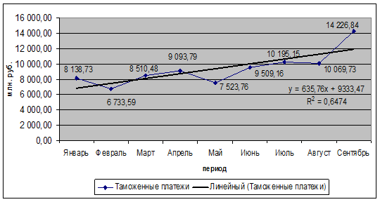 для линейного уравнения тренда равен 0,6474, т.е. найденное уравнение регрессии объясняет 64,74% вариации объема таможенных платежей и 35,26% изменений происходит за счет влияния прочих факторов.