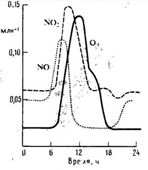 Интересно проследить за изменением концентрации основных компонентов, участвующих в образовании фотохимического смога (например для города с активными физико-химическими условиями) в течение суток