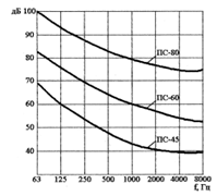 Перший метод нормування є основним для постійних шумів. Тут нормуються рівні звукових тисків в 8 октавних смугах частот з середньо-геометричними частотами 63; 125; 250; 500; 1000; 2000; 4000; 8000 Гц. Деякі граничні спектри показані на рис. 2., з якого видно, що із зростанням частоти допустимі рівні зменшуються. Наприклад: ПС-80, де 80 – допустимий рівень звукового тиску в октавній смузі з середньо-геометричною частотою 1000 Гц. Сукупність 8 допустимих рівнів звукового тиску називається граничним спектром.