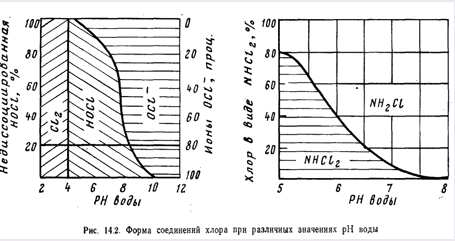 Бактерицидное действие хлора уменьшается с повышением рН воды. Поэтому обеззараживание воды хлором следует производить по возможности при более высоких температурах и низких значениях рН (до ввода щелочных реагентов). Содержащиеся в воде органические примеси, способные к окислению, восстановители, коллоидные и диспергированные вещества, обволакивающие бактерии, тормозят процесс обеззараживания воды.
