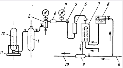 1 — промежуточный баллон; 2 — фильтр со стекловатой;3— редукционный клапан для снижения давления хлор-газа; 4— манометр; 5 — измерительная диафрагма; 6 — ротаметр; 7 — смеситель; 8 — подача водопроводной воды; 9 — эжектор, создающий разряжение в хлораторе; 10 — отвод хлорной воды на дозирование; 11 — весы; 12 — баллон с хлором
