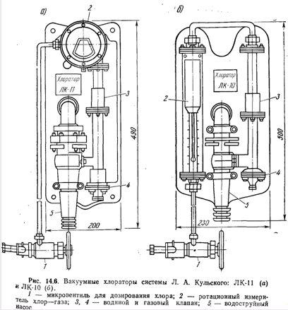 Вакуумные хлораторы системы Л. А. Кульского показаны на рис. 14.6 — хлоратор ЛК-11 средней производительности (рис. 14.6,а) для расхода хлора в пределах 0,5 ... 4,5 кг/ч и хлоратор ЛК-10 малой производительности (рис. 14.6,6), рассчитанный на расход хлора в пределах 40 ... 800 г/ч.