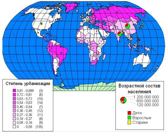 Этот пример был создан на основе файла Mapstats.xls, включённого в стандартный набор примеров по картографии для MS Excel. В него включены демографические данные по России, по странам мира и Европы – половозрастная структура, количество рабочих и т.п. К сожалению, из-за неполноты сведений в файле Mapstats.xls многие страны выглядят на карте белыми пятнами.