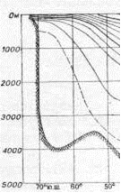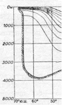Изопикны на меридиональных разрезах, следуя за изотермами, приподняты в экваториальной зоне в связи с восходящими потоками, приносящими к поверхности более плотные глубинные воды. В результате этого здесь создаются наибольшие в Мировом океане вертикальные градиенты плотности. Преобладание нисходящих потоков в низких широтах, вызывающееся антициклоническими круговоротами, приводит к опусканию изопикн. Вертикальные градиенты плотности воды в тропической зоне меньше, чем в экваториальной, однако больше, чем в умеренной и полярной зонах (рис.17).