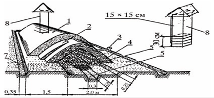 1 - окончательное укрытие бурта землёй; 2 - первое укрытие бурта землёй; 3 - трубка с термометром; 4 - солома; 5 - картофель; 6 - вентиляционный канал; 7 - канава для стока воды; 8 - вентиляционный короб.