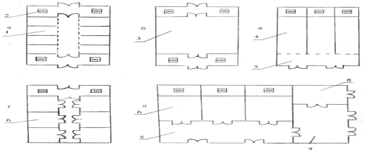 серии ЛМК) из лёгких металлических конструкций с цехом товарной подготовки; 1 - закром; 2 - вентилятор; 3 - помещения для размещения продукции навалом или в контейнерах; 4 - секции открытые; 5 - тамбур; 6 - секции изолированные; 7 - цех товарной подготовки; 8 - бытовые помещения, ремонтная мастерская, комната отдыха.