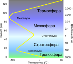Следующийслой, лежащий над стратосферой, это мезосфера. Мезосфера начинается на высоте 50 км и простирается до 80—90 км. Температура воздуха до высоты 75—85 км понижается до −88 °С. Верхней границей мезосферы является мезопауза, где расположен температурный минимум, выше температура вновь начинает расти. Далее начинается новый слой, который называется термосферой. Температура в ней быстро растет, достигая 1000 – 2000 °С на высоте 400 км. Выше 400 км температура почти не меняется с высотой. Температура и плотность воздуха очень сильно зависят от времени суток и года, а также от солнечной активности. В годы максимума солнечной активности температура и плотность воздуха в термосфере значительно выше, чем в годы минимума.