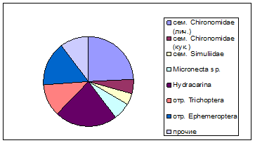 По численности в водной фракции дрифта преобладают личинки и куколки комаров-звонцов Сhironomidae, личинки мошек Simuliidae, личинки поденок Baetis