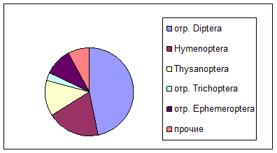 В водной фракции дрифта наиболее разнообразно представлены амфибиотические насекомые: Ephemeroptera (16 видов), Trichoptera (12 видов), Diptera (5 семейств).
