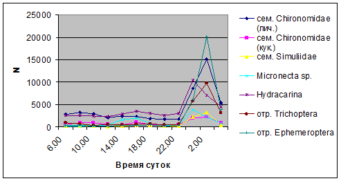 В определении суточной динамики водной фракции дрифта наибольшую роль играют личинки Сhironomidae, личинки поденок Ephemeroptera, Trichoptera, водные клещи Hydracarina, воздушной фракции дрифта – имагинальные стадии Сhironomidae, Hymenoptera и Thysanoptera.