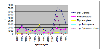 В большинстве случаев максимальные пики интенсивности воздушной фракции дрифта приходятся на ночное время суток. Исключение составляют показатели интенсивности дрифта 6 июля 2005 г. и 11 июля 2006 г. Здесь максимальные пики интенсивности дрифта отмечены в дневное время. Это связано с увеличением суточной активности взрослых особей Сhironomidae, Hymenoptera и Thysanoptera.