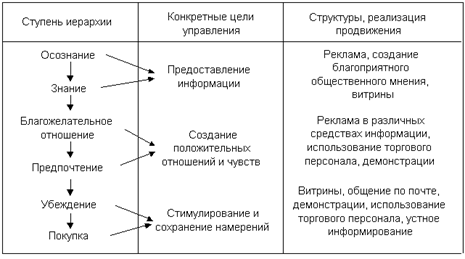 Цели продвижения: стимулирование спроса и улучшение образа компании. Конкретные действия зависят от так называемой иерархии воздействия указанной в виде таблице на рисунке 1[2]