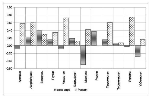 Розраховані значення коефіцієнтів кореляції для країн СНД стосовно показників країн зони євро й Росії представлені на мал. 3.2. При розрахунках використався ряд річних значень темпів росту реального ВВП у країнах СНД за період з 1999 по 2008 р. [12, с.119]